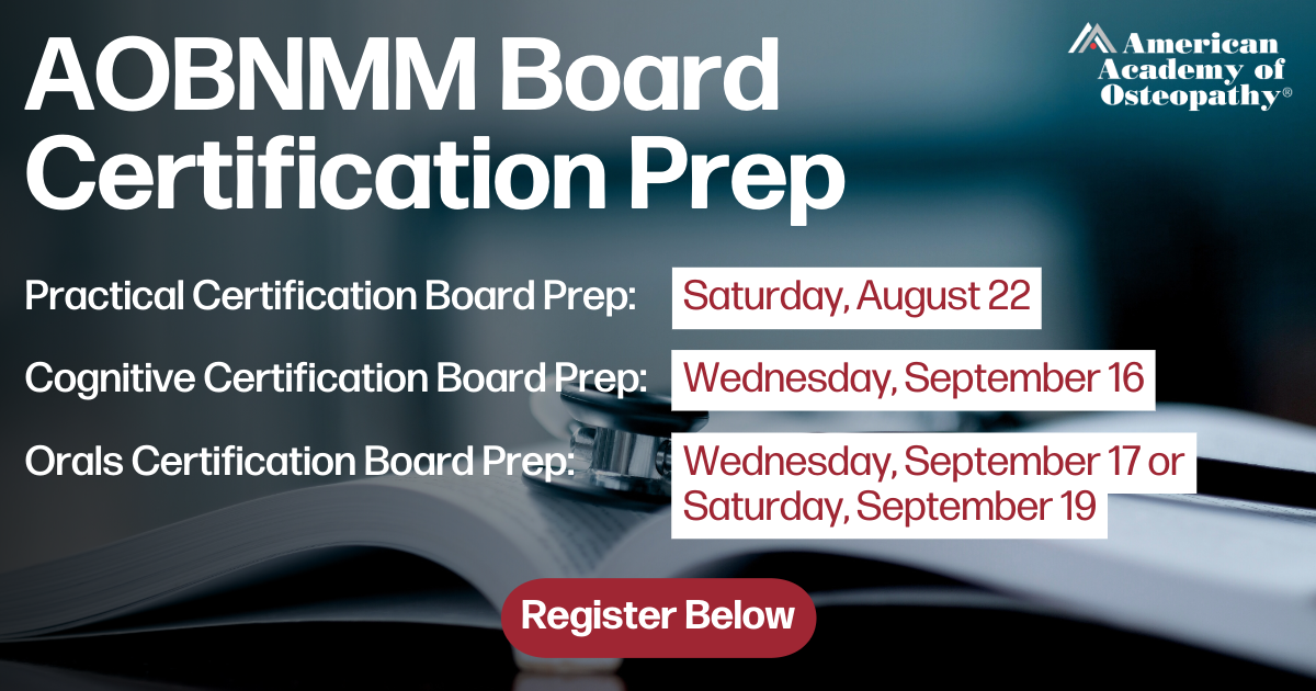 Date: Saturday, August 22, 2026 Time: 12:00 – 2:30 pm EDT Location: Virtual (Zoom) CME: 2.5 AOA Category 1-A credits Practical Certification Board PrepAOBNMM Cognitive Certification Board Prep Cognitive Certification Board PrepOrals Certification Board Prep Course Director: Roger W. Beaumont, DO The 7 S's of an Efficient Osteopathic Visit